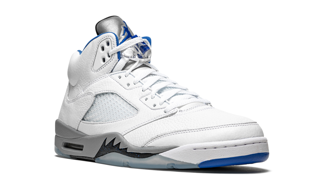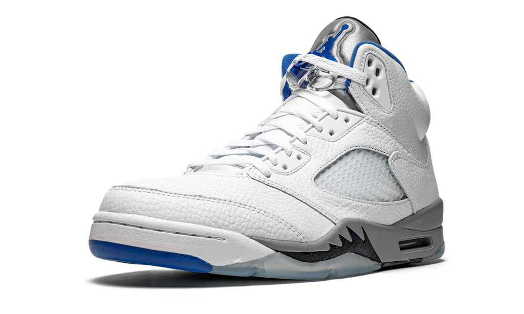 The Air Jordan 5 Stealth features subtle changes that differentiate it from the 2006 version. The midsole features a grey base with black accents hit with blue splatter paint, contrasting the blue spikes on the OG pair. Other noticeable differences include a new black embroidered Jumpman on the heel and black lining behind the classic reflective tongue. Outside of those additions, the 2021 Stealth brings familiar elements to the 15-year-old release, with a white tumbled leather upper and translucent rubber mesh on the panels for breathability.