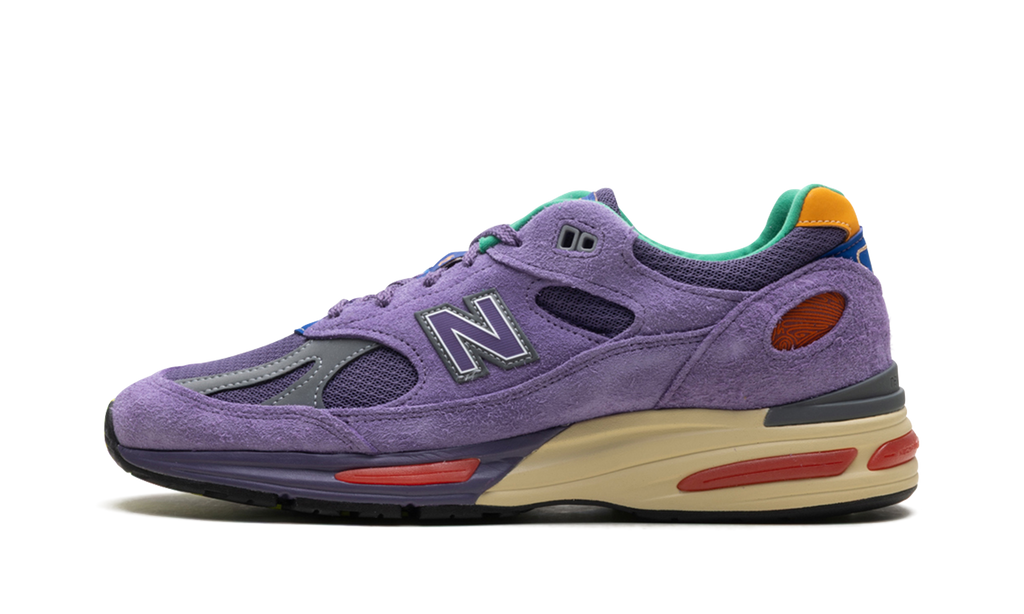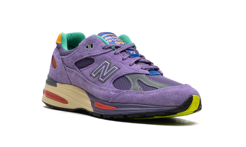 The New Balance 991v2 MiUK Salehe Bembury Colors Be The Palette is an athletic shoe with a Purple mesh upper overlaid with Purple suede. A bicolor midsole coordinates in Purple and cream, as pops of orange, yellow, and green appear throughout the midsole and upper. A blue and gold Salehe Bembury New Balance 991 tongue tag finishes the ensemble.
