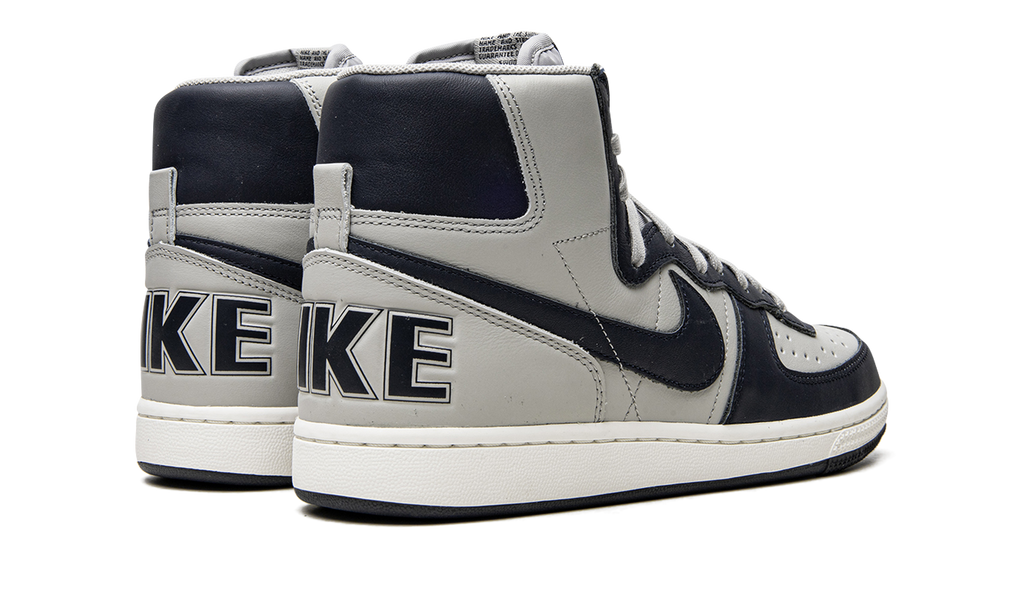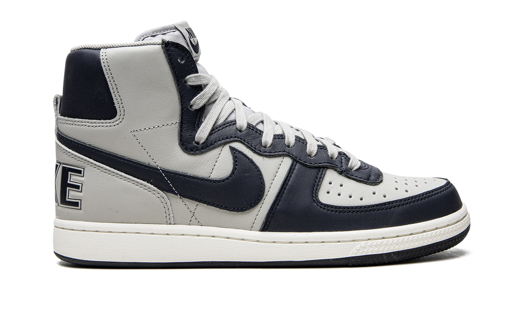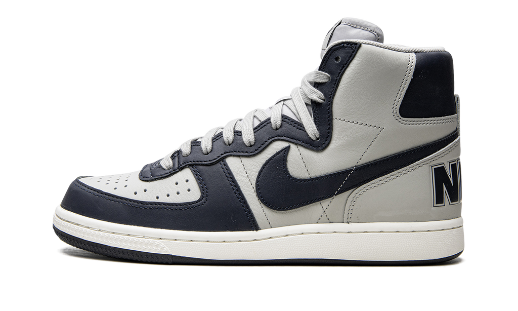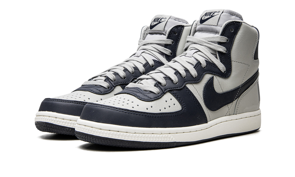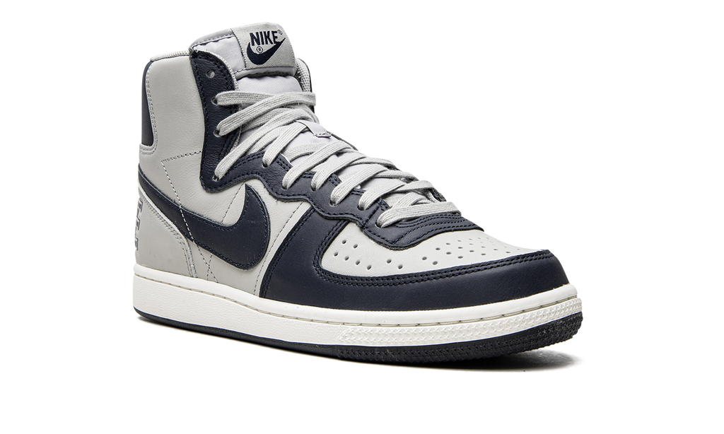 The Nike Terminator High Georgetown 2022 comes in dark obsidian sail and grey colors. The laces and the smooth leather foundation are light grey.